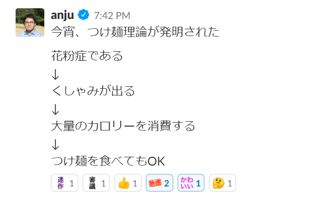 Yuu:そうそう、なぜかみんな Slack 上だとめちゃめちゃ元気!!!反応もびっくりするくらい早いし、絵文字リアクションも多いよね。