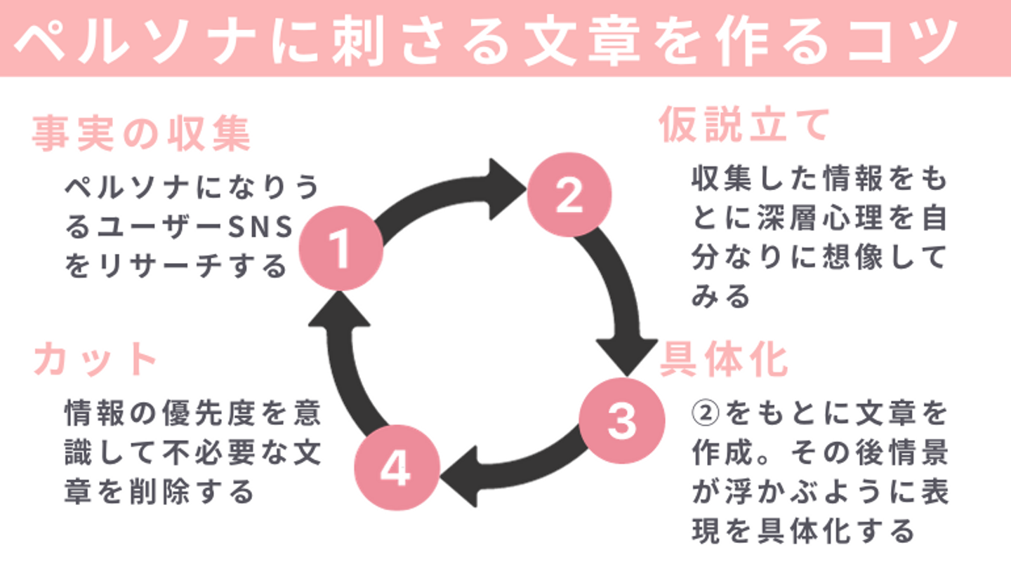リサーチやペルソナ設定を踏まえて「じゃあこの人になんて声をかけてあげれば心が動くのか」を想像して文章を書くことが大切。