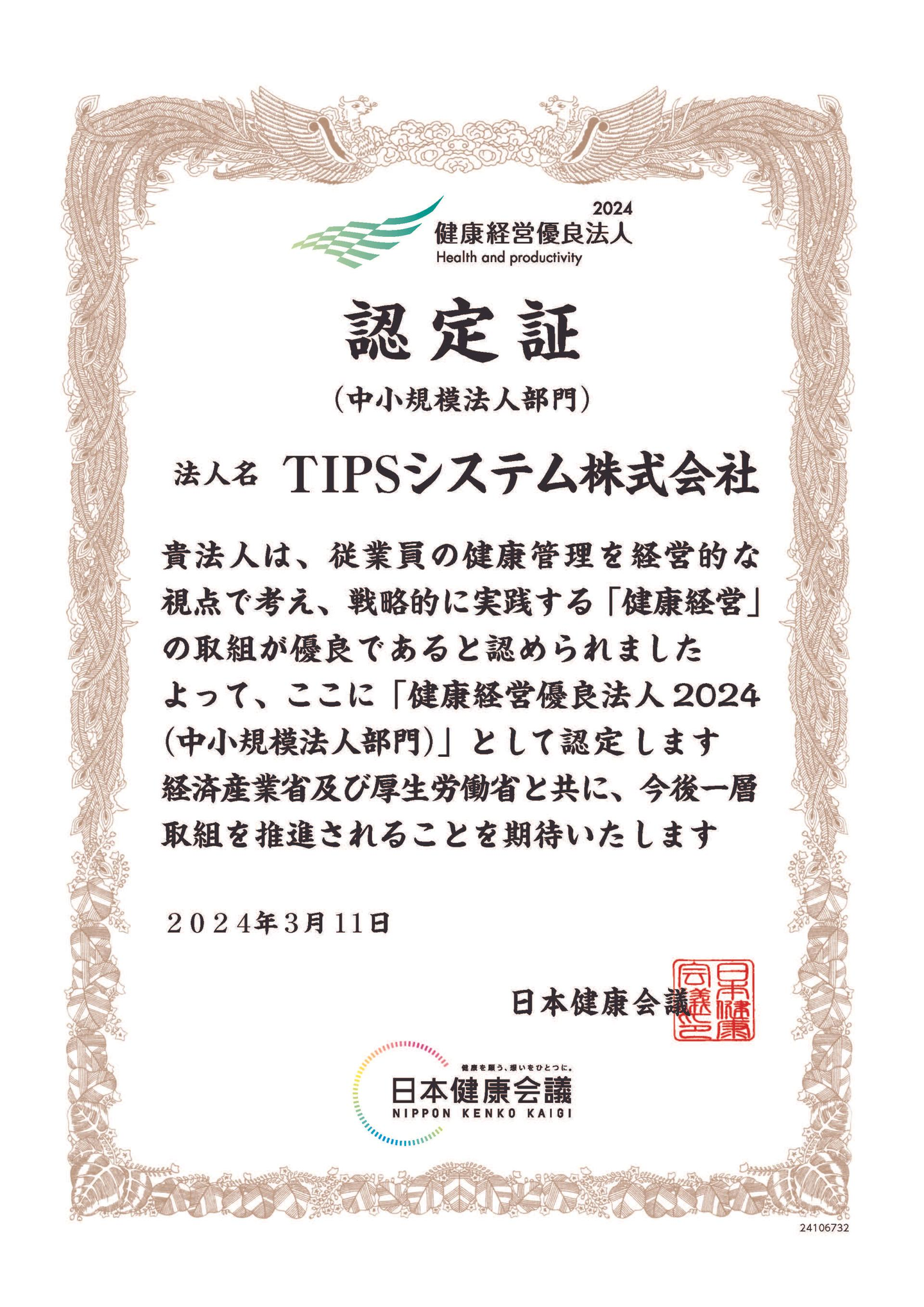 という取り組みが評価され、令和元年より6年連続で健康経営優良法人の中小規模法人部門に