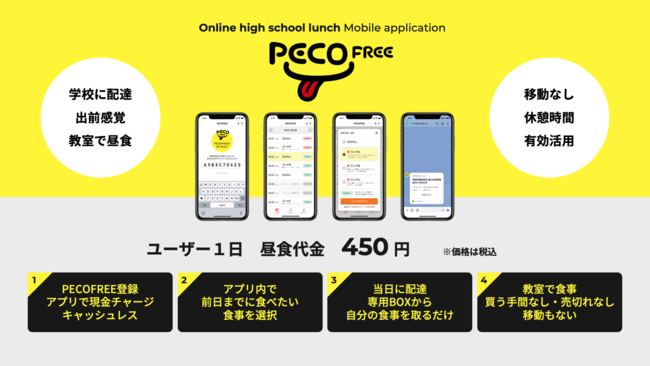 ペコフリーは学校単位の導入決定から開始できる。生徒が食べたいランチ(栄養士監修の献立を毎日3種類の弁当から選択可能)を前日までにLINE上のLINEミニアプリで予約注文すると、当日、学校に設置された受取り・返却BOXに弁当が配送されます。1食(弁当) あたり450円(税込※価格変更可能)で、保護者がチャージしたポイントから支払われます。