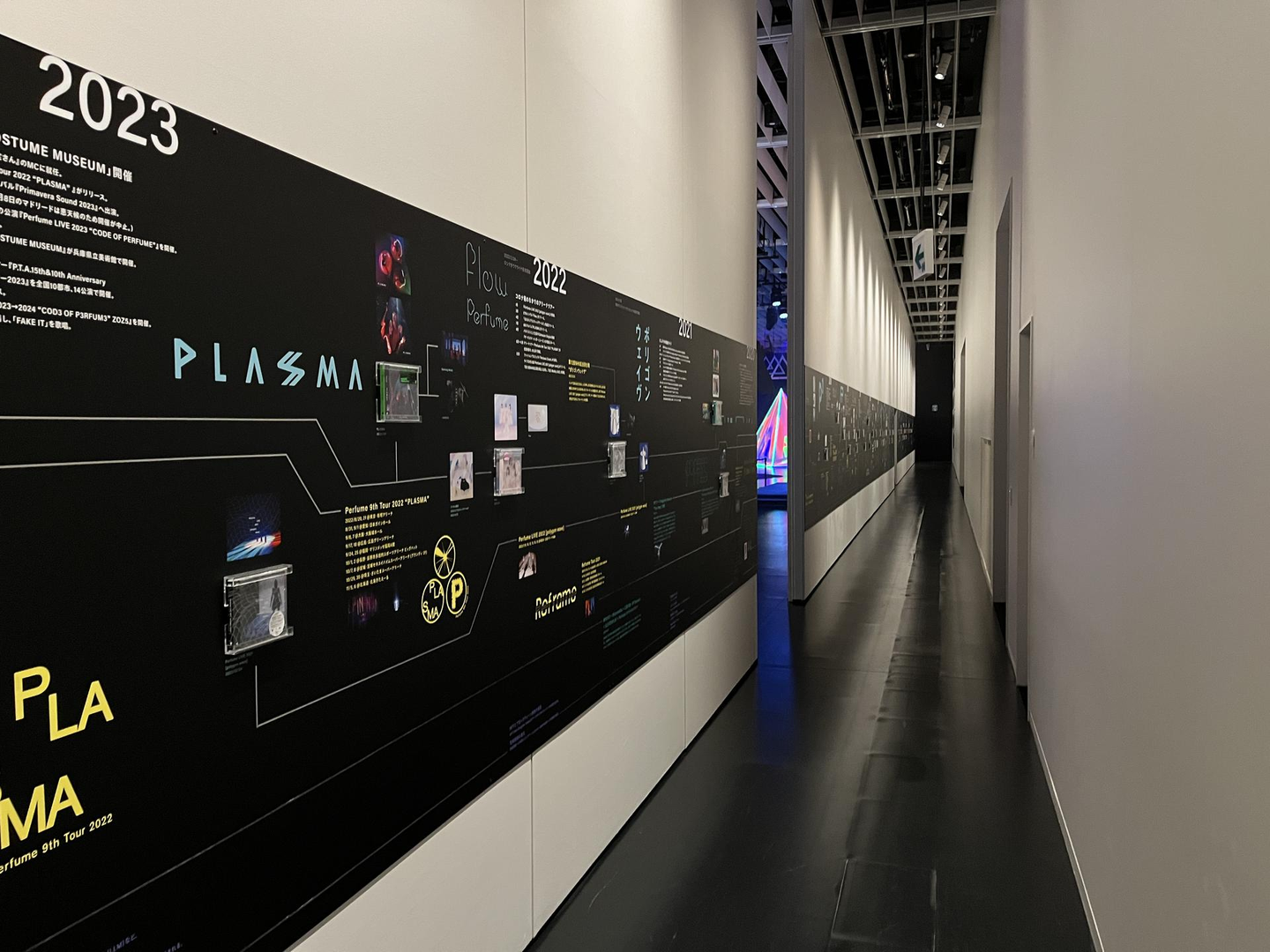 ソフトクリームを食べたあとは、8FのTOKYO NODEのエントランスで他のスタッフとも合流し、専用のエレベーターで45Fに上がりました。会場内には巨大なオブジェや25周年記念動画のほかに、ライブの擬似体験など参加型のコンテンツが多くあって楽しかったです!通路に貼られていた年表にはPerfumeのこれまでの歴史が書き込まれているほか、アルバムやフライヤーが飾られていてかなり見応えがありました…!