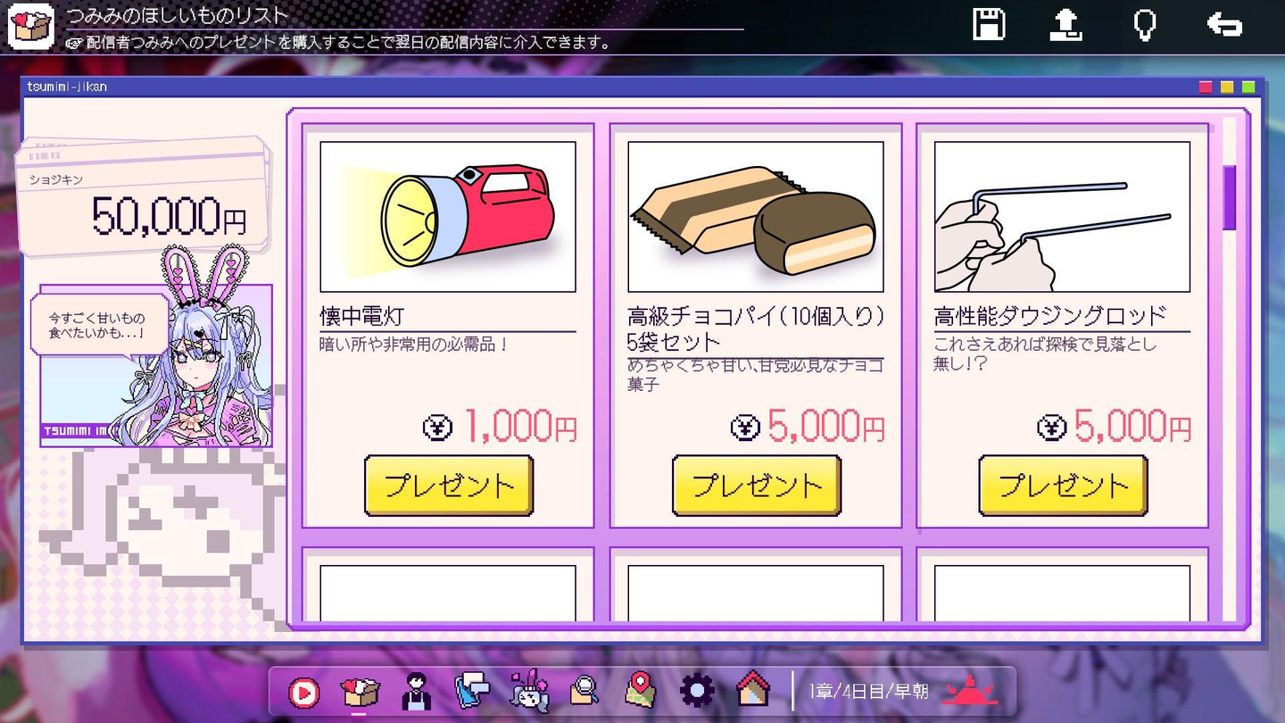 物語は14日間のサイクルで進行します。昼は配信で見つけた違和感を手がかりに、SNSやファンサイト、地図検索を通じて情報を追い、夜は投げ銭やコメント、プレゼントでつみみの配信に介入していきます。集めた情報は調査ファイルに蓄積され、やがて隠された過去と失踪事件の核心へとつながっていきます。プレゼントの内容次第では、翌日の配信で思わぬ反応が返ってくることも。