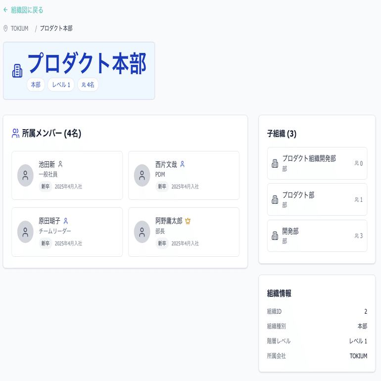 社員数が増えるにつれて「この人はどんな仕事をしているんだろう?」「どの部署にいるんだろう?」といった声が社内で聞かれるようになりました。そうした課題に応えるための機能です。組織図ページではメンバーの所属とその部署の役割が簡単に確認できるようにしました。
