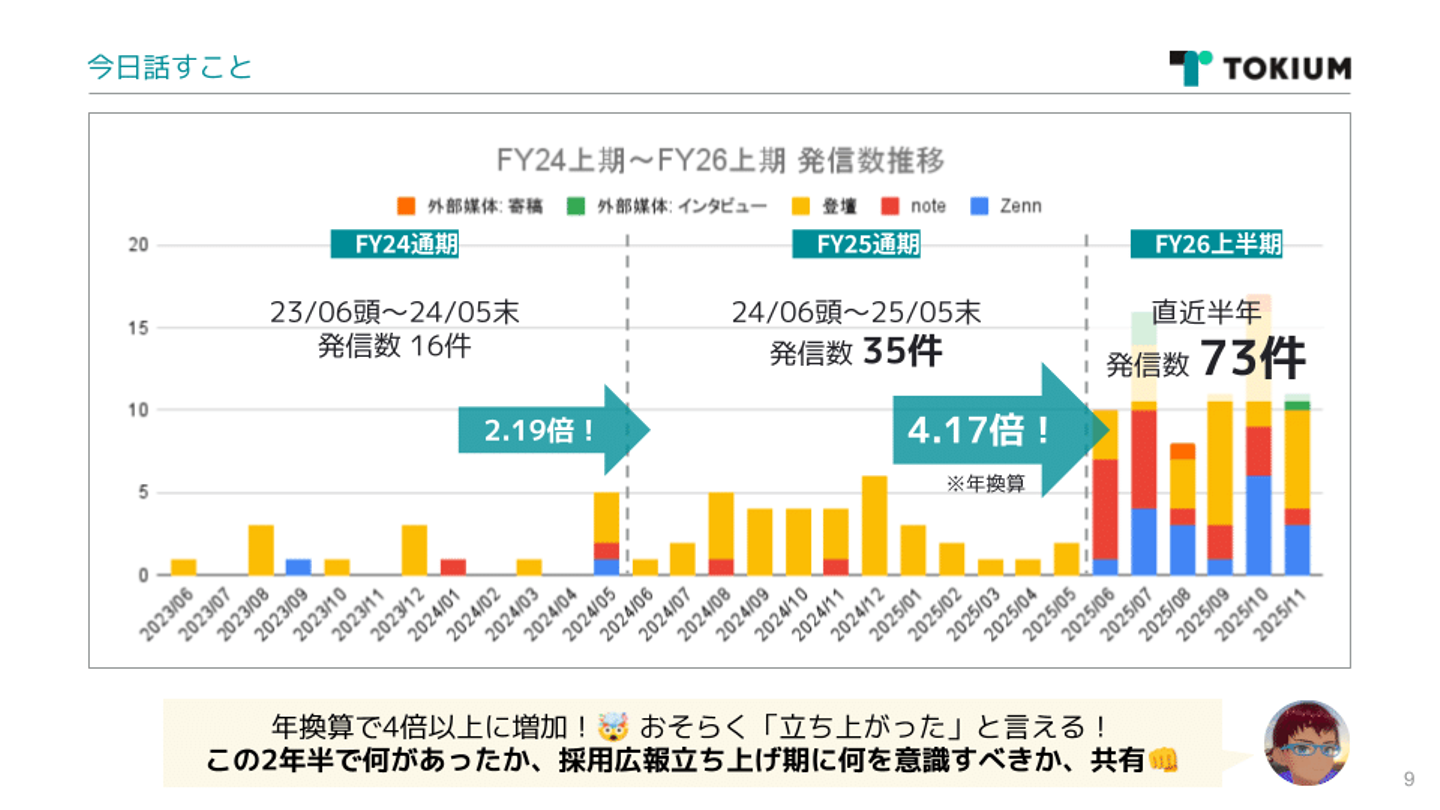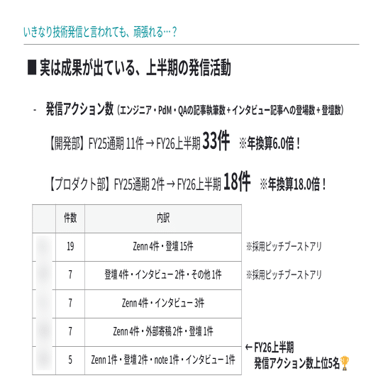 特にAIエージェント事業が立ち上がった2025年6月以降は、「経理AIエージェントのカテゴリで国内No.1の認知を獲得する」ことを全社目標に掲げ、noteやZennでの記事発信を業務として強化しました。