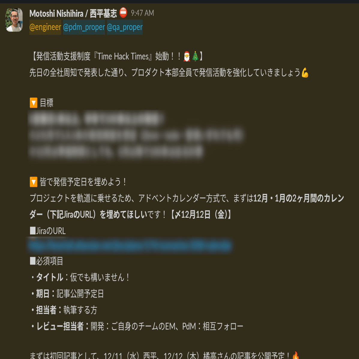 そして全体周知の直後、CTOの西平に「アドベントカレンダー方式で発信をしよう!」という呼びかけがありました。目標は、12月〜翌年1月にかけて月20件(→1営業日1件)の発信を達成すること。