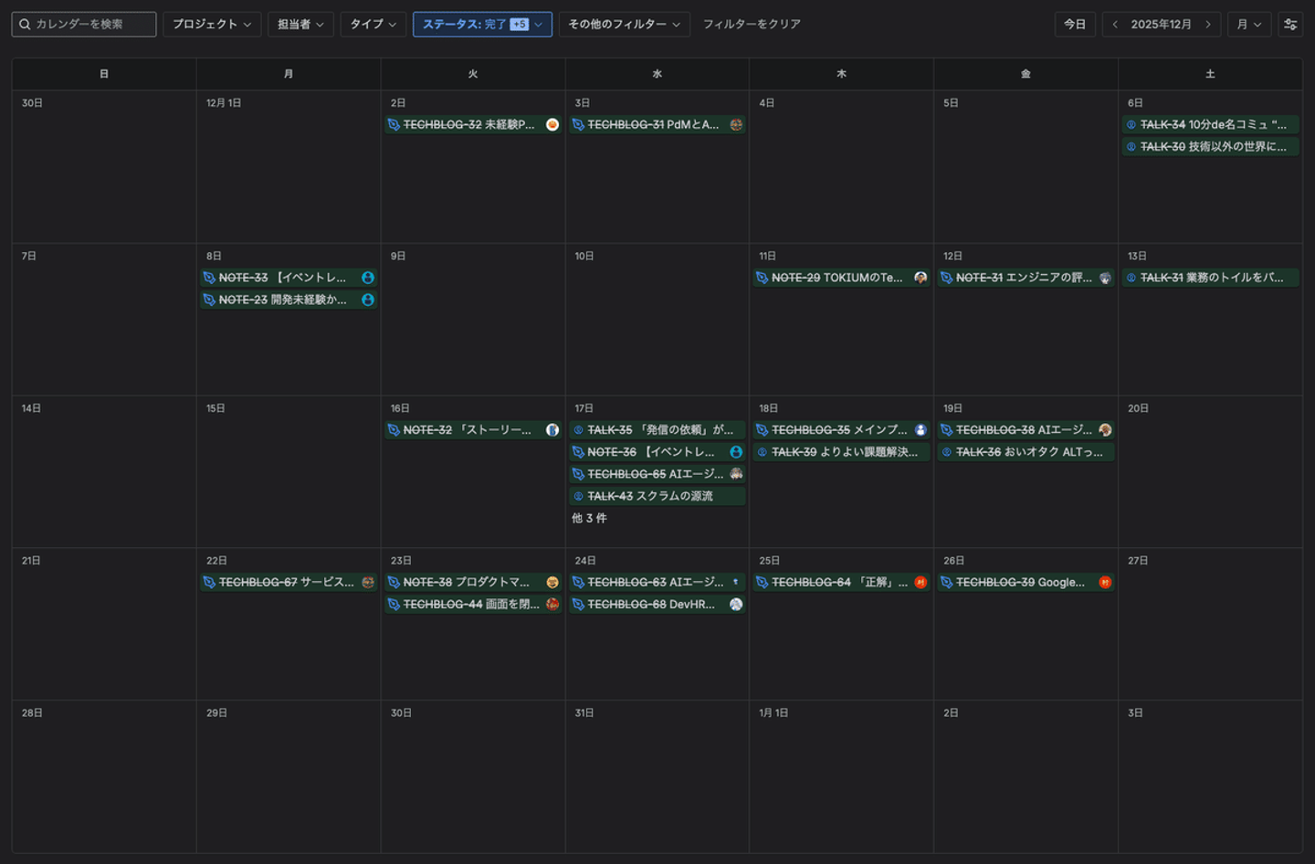 挙手制としたため、メンバーが集まるか正直不安でしたが、フタを開けてみれば一瞬でカレンダーが埋まり、12月に生まれた発信は合計29件!呼びかけがされた翌週から10営業日(12月16〜26日)に限定すると、なんと20件!!!メンバー1人1人が応えてくれたこの盛り上がりは、現在のTOKIUMを象徴する出来事だったと感じます🔥