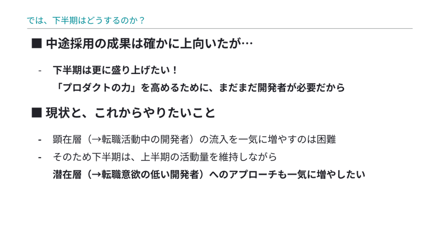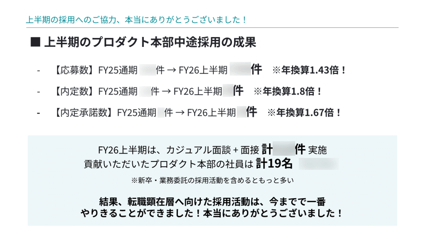 この時間では、単に協力依頼をするだけではなく、現場メンバーの貢献によって生まれた採用・発信活動の成果について共有し、称賛しあうセクションも設けました。僕も投影資料の作成に関わりましたが、開発業務への上乗せとなるハードな依頼を少しでも前向きに受け止めてもらえるよう、伝え方には細部までこだわったつもりです。