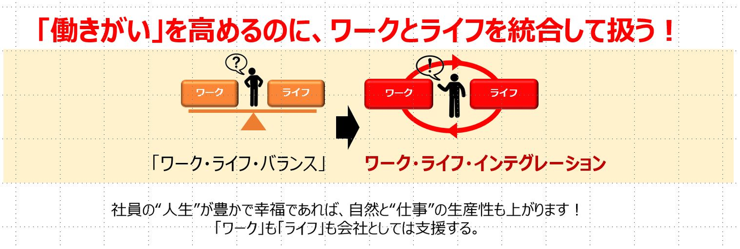 私たちは、ワークとライフを統合させて混ざり合わせながら、その両方を豊かに、むしろ混ざり合う事で相乗効果がでる状態を理想としています。そして、多くの働きがいのための施策がこの「ワーク・ライフ・インテグレーション」の考えに基づいています。