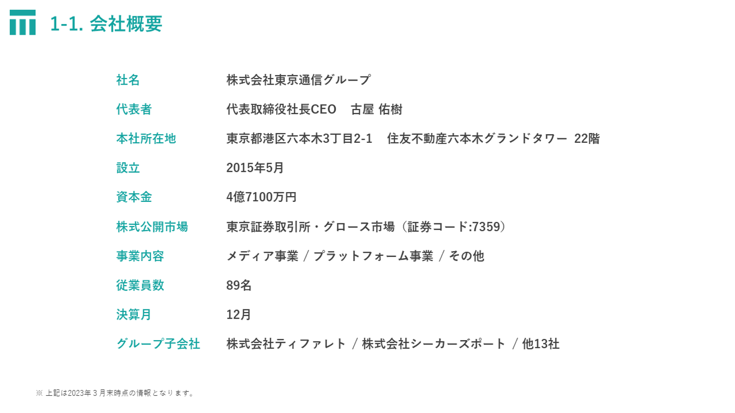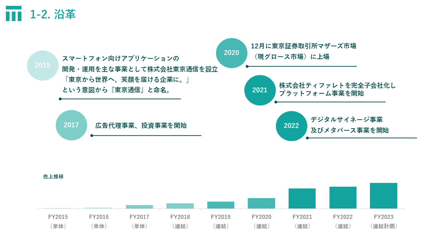 2023年4月1日には持株会社体制へ移行し、株式会社東京通信グループとして事業推進しております。創業から8年目のまだ新しい会社ではありますが、創業から5年目で上場し、売上も右肩上がりの順調な成長を遂げております。