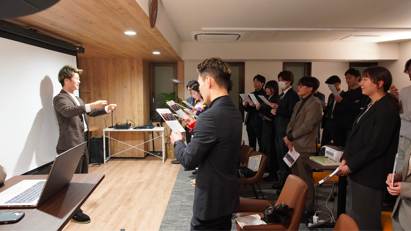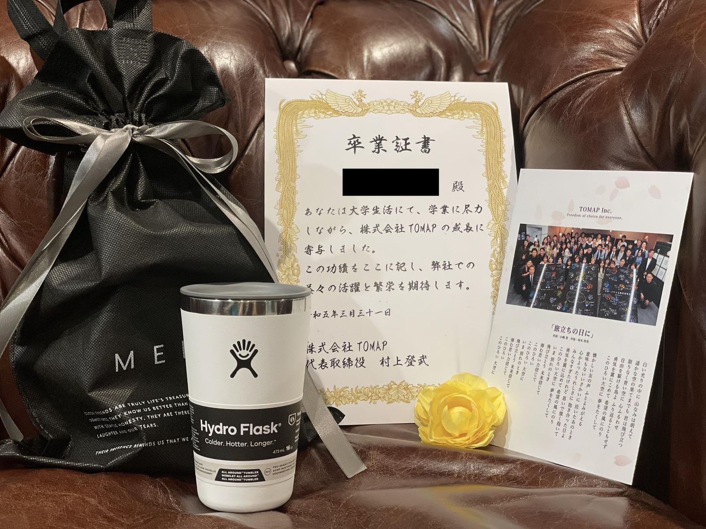 TOMAPのインターンを卒業する人だけではなく、大学を卒業し、社員として引き続きTOMAPに残る人に対しても、これまで学生時代をTOMAPに費やしてくれたことへの感謝の気持ちを伝える場として、卒業式を執り行いました。