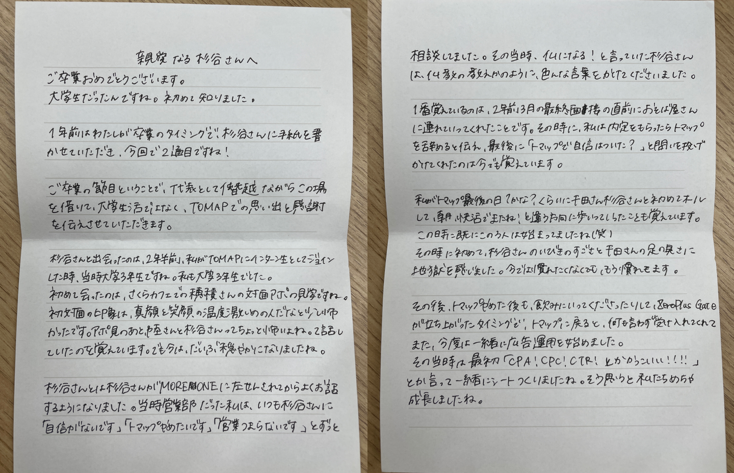 1番覚えているのは、2年前、3月の最終面接の直前におそば屋さんに連れていってくれたことです。その時に私が「今選考中の企業から内定をもらったらTOMAPを辞める」と伝えると、「TOMAPで自信はついた?」と問いを投げかけてくれたのは今でも覚えています。