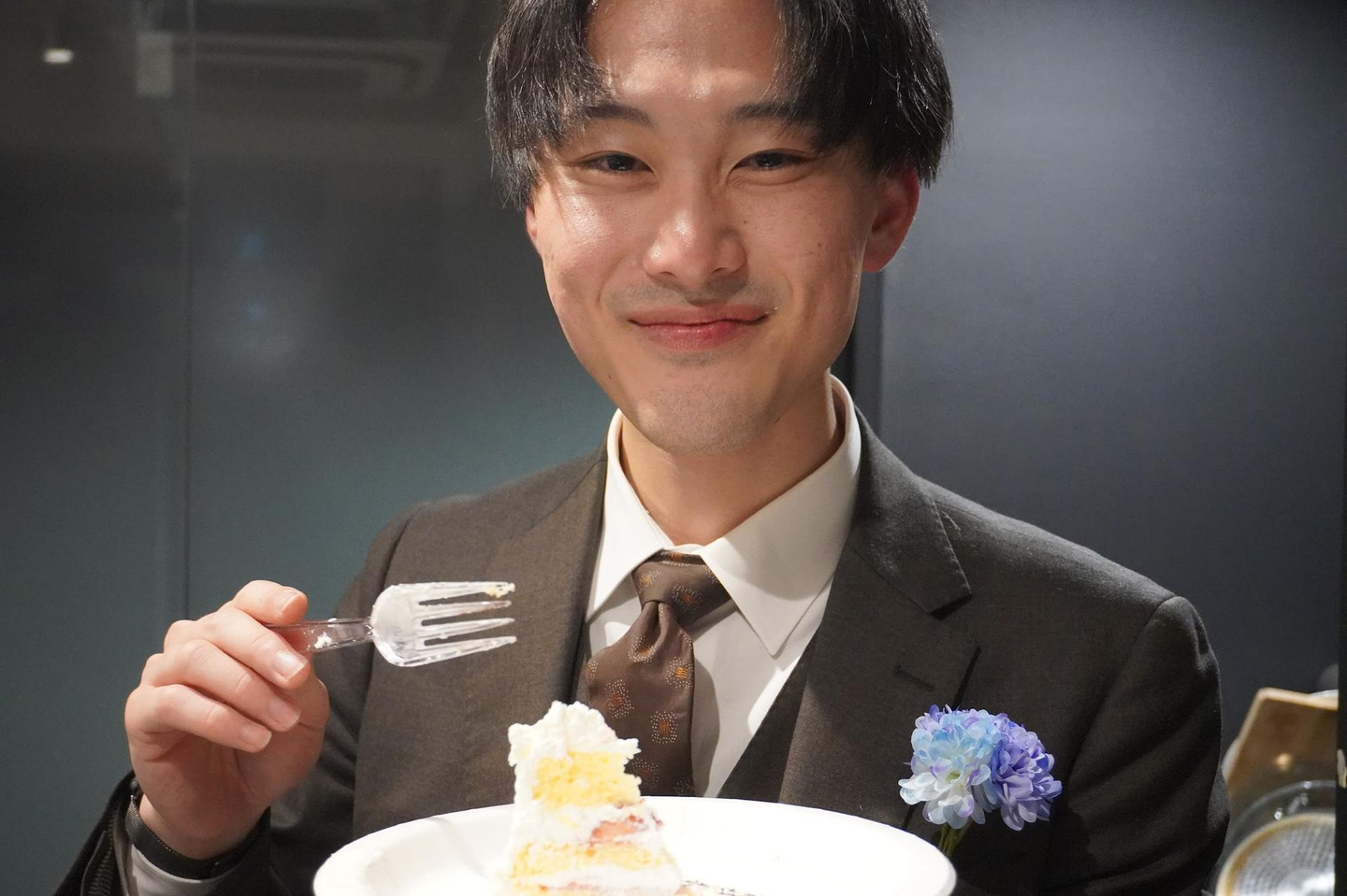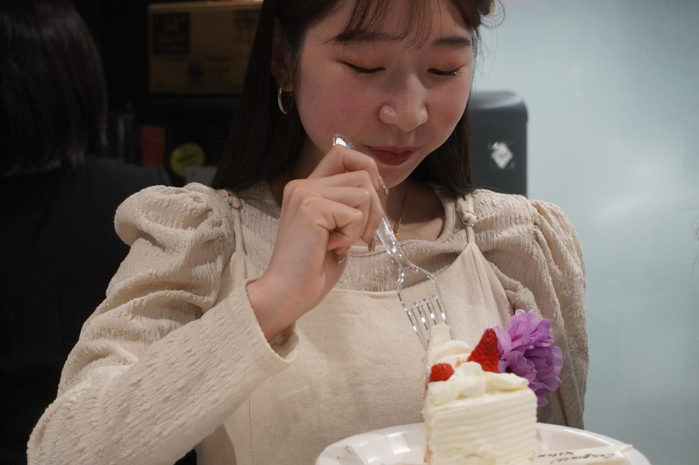 ▲ケーキを美味しそうに食べるデザイナーインターンのHさん