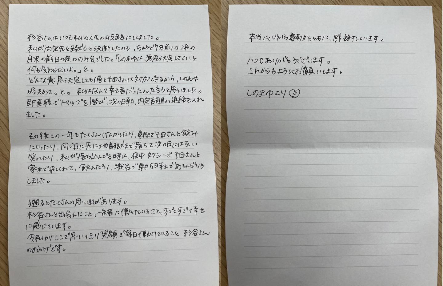 中でも特に印象深かったのは、マーケ部のしのまゆさん(篠原万由子さん)がマーケ部責任者である杉谷さんへ宛てた手紙です。