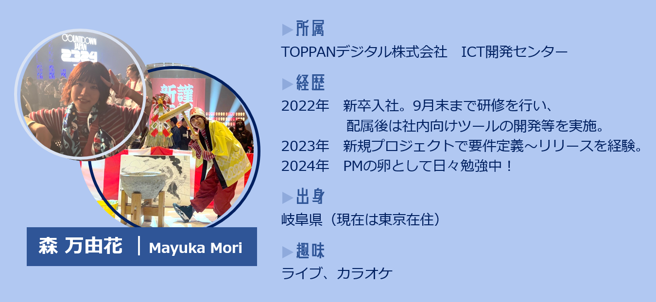 TOPPANデジタル株式会社 ICT開発センターの森万由花と申します。((あだ名は”まっきー”です😊))