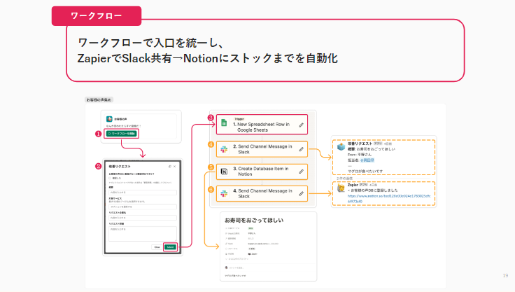 ● 外部サービスzapierを活用して、Slackでのフロー、Notionへのストックを実現