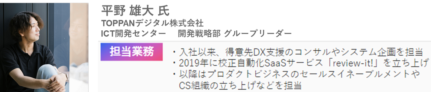 2023年10月のホールディングス化に伴い、DXを推進する組織がTOPPANデジタルとして分社化しました。私たちが提供するプロダクト『review-it!』のチームは、営業部隊が別法人になったことをきっかけに、ビジネスの体制を一から作ることにしました。