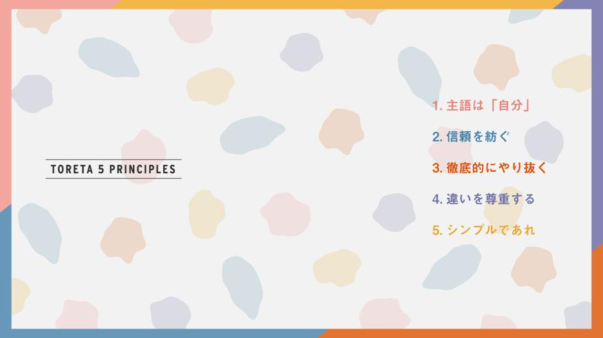 昨年12月に策定されたトレタ社員の行動指針「5つの原則」をカラフルに表現しました。