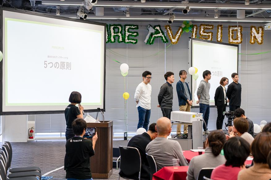 そして行動指針である「5つの原則」は、私たち社員1人1人が実際に体現していくべき指針であるというメッセージを込めて、PENGUINSプロジェクトメンバー全員が前に出て、自分自身の決意表明と併せて発表しました。
