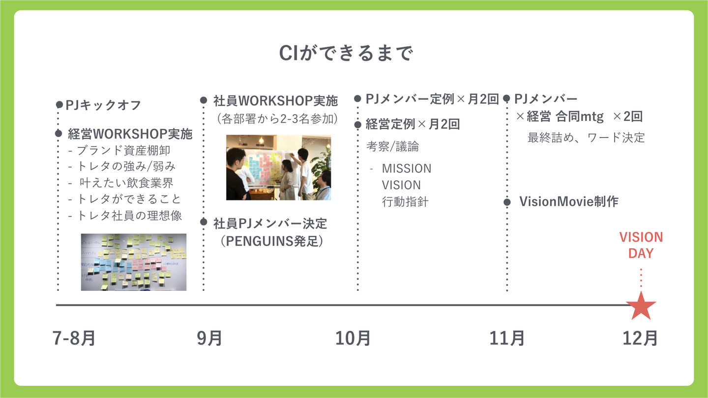 VISIONDAYでの新CI発表に向け、どのように進めたかスケジュールはこちらの図をご参照ください。