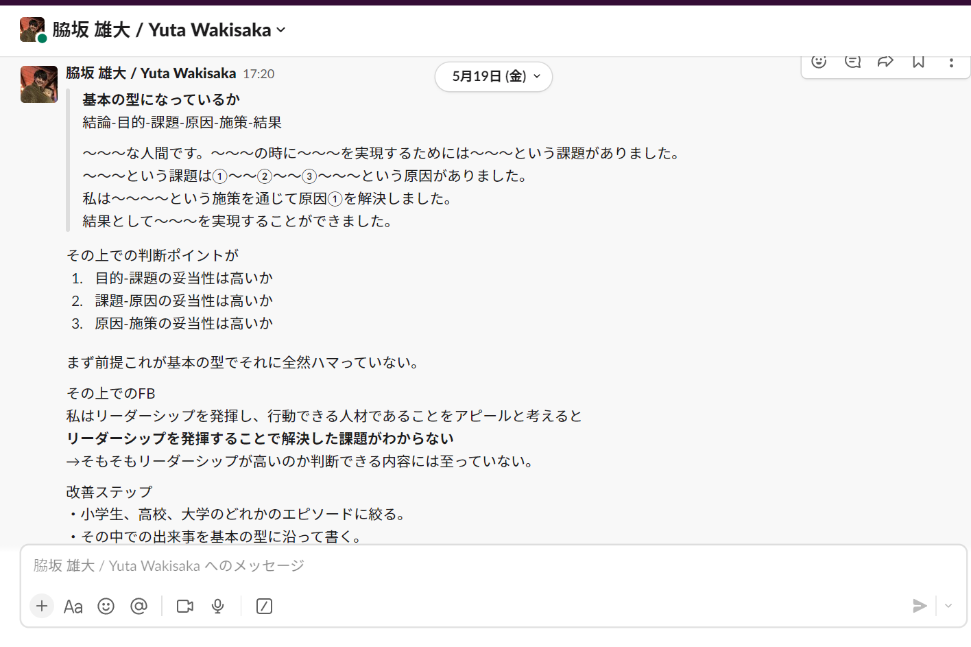 これを人事の脇坂さんにslackで提出して、FBをもらうことに。