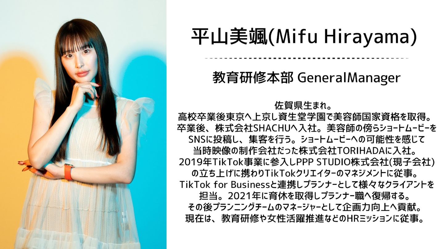 新卒は美容師としてキャリアをスタートしましたが、ショートムービーマーケティングに興味を持ち、当時映像の制作会社だったTORIHADAに入社しました。2019年TikTok事業に参入するタイミングで、子会社であるPPP STUDIOの立ち上げに携わり、TikTokクリエイターのマネジメントを担当しました。その後、2021年に産育休を取得し、復帰後はプランニングチームのマネージャーに昇格しました。