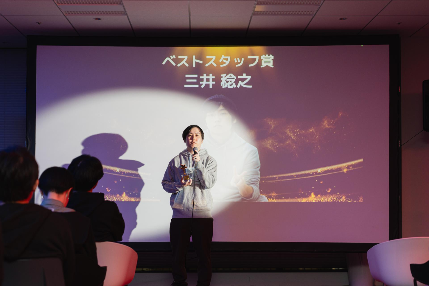 2025年度上半期のロマンサミット(社員総会)で、ベストスタッフ賞を受賞した3人。最優秀賞は、FANMEチームでエンジニアをしている三井さんでした🎉