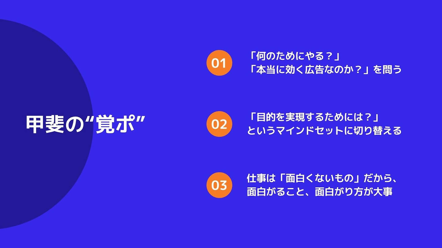 甲斐:そうですね、「覚醒ポイント」までの自分はずっとアウトプットを作ることだけ考えていたように思います。「この資料を仕上げなくちゃ」とか、「このイベントを完成させないといけない」とか。そうではなく、大事なのは「それは何のためにやるのか?」「それは本当に効くのか?」という本質です。広告って、効かないと意味無いですから。