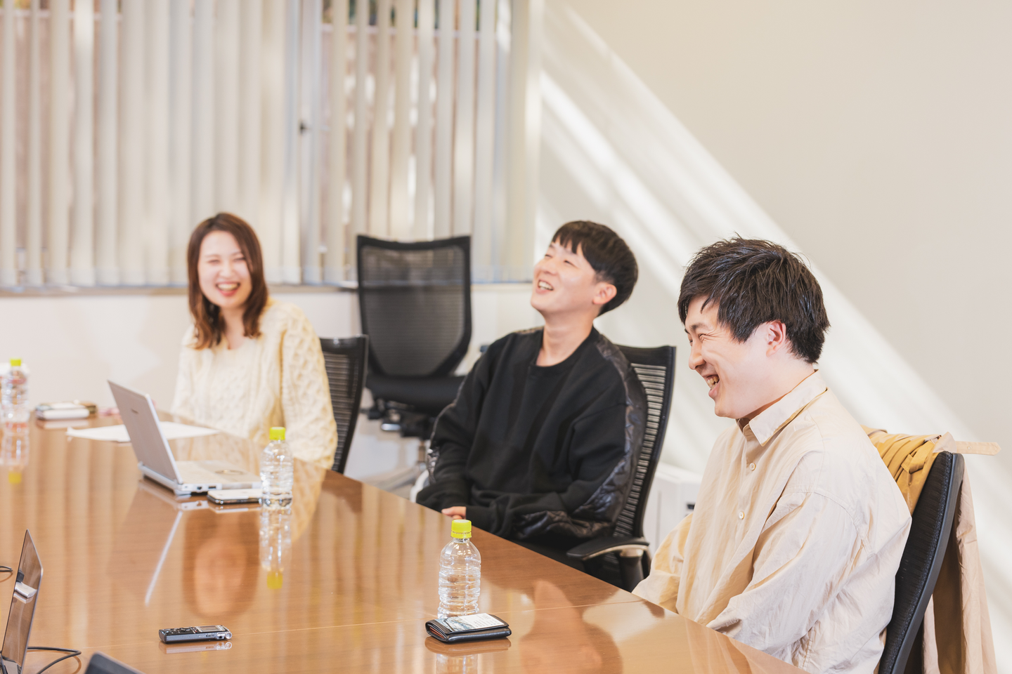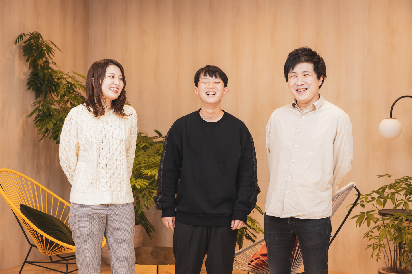 写真向かって右から、橋本 弘平(クリエイティブディレクター)、甲斐 智大(体験デザイン本部副本部長補佐、プランニングも強いプロデューサー)、染川 智美(PR・SNSプランナー、SNS起点のデジタル戦略が得意)の3名です。