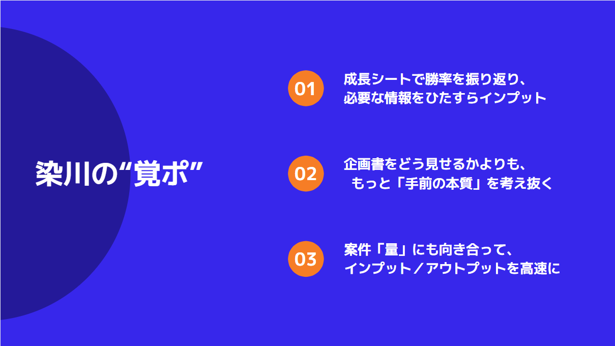染川:前職がPR会社だったこともあって、入社1年目は「専門職」としていかに貢献できるかをすごく考えていました。実際、入ってすぐにたくさんの案件でメンバーに加えてもらえたのですが、1年後に「成長シート」で振り返ってみると、私としてはコンペやオリエンの“勝率”が良くなかったんです。企画を出しても実現できなかったり。
