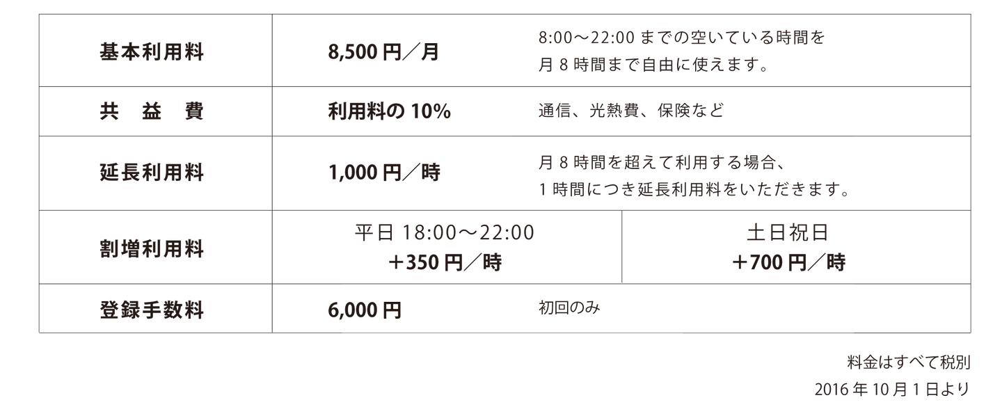 メンバーで教室をシェアしながら、得意なことを活かしてお稽古や塾などをはじめることができます。月額8500円で、8:00〜22:00までの空いている時間を月8時間まで自由に使えます。