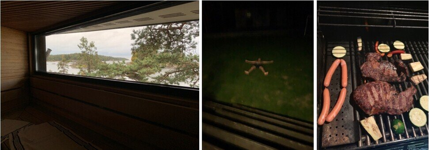海を望むサウナ室(左) サウナ後は芝生ダイブ(中)夕食はBBQ(右)