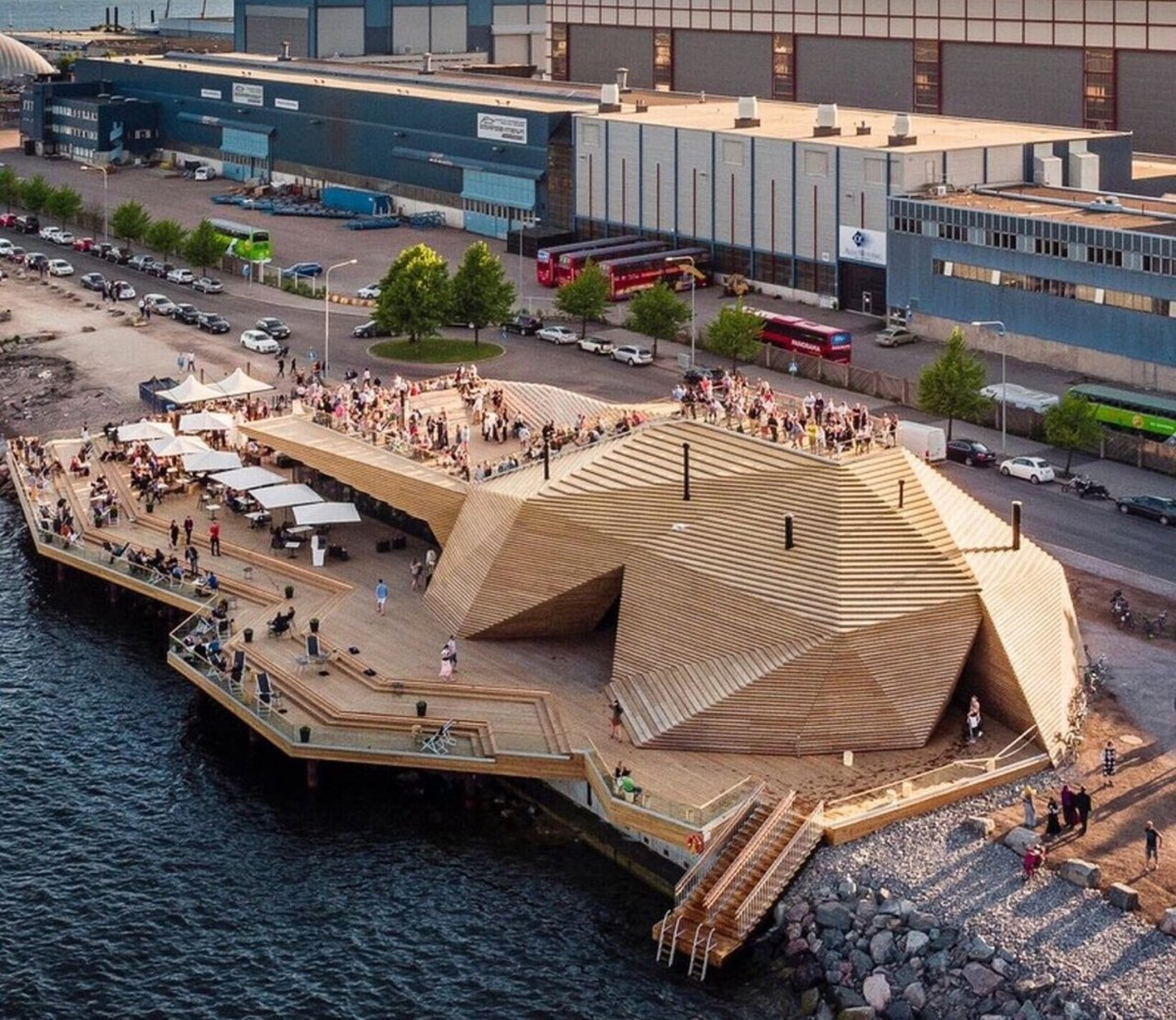 2日目は建築巡りからスタートし、その後新しく出来た『LOYLY(ロウリュ)』というサウナ施設へ。フィンランドの公衆浴場では男女が一緒に入れるサウナは少ないですが、ここはOK(もちろん水着着用)。サウナから上がった後も、水着のまま暖炉を囲んでビールが飲めるのが魅力。
