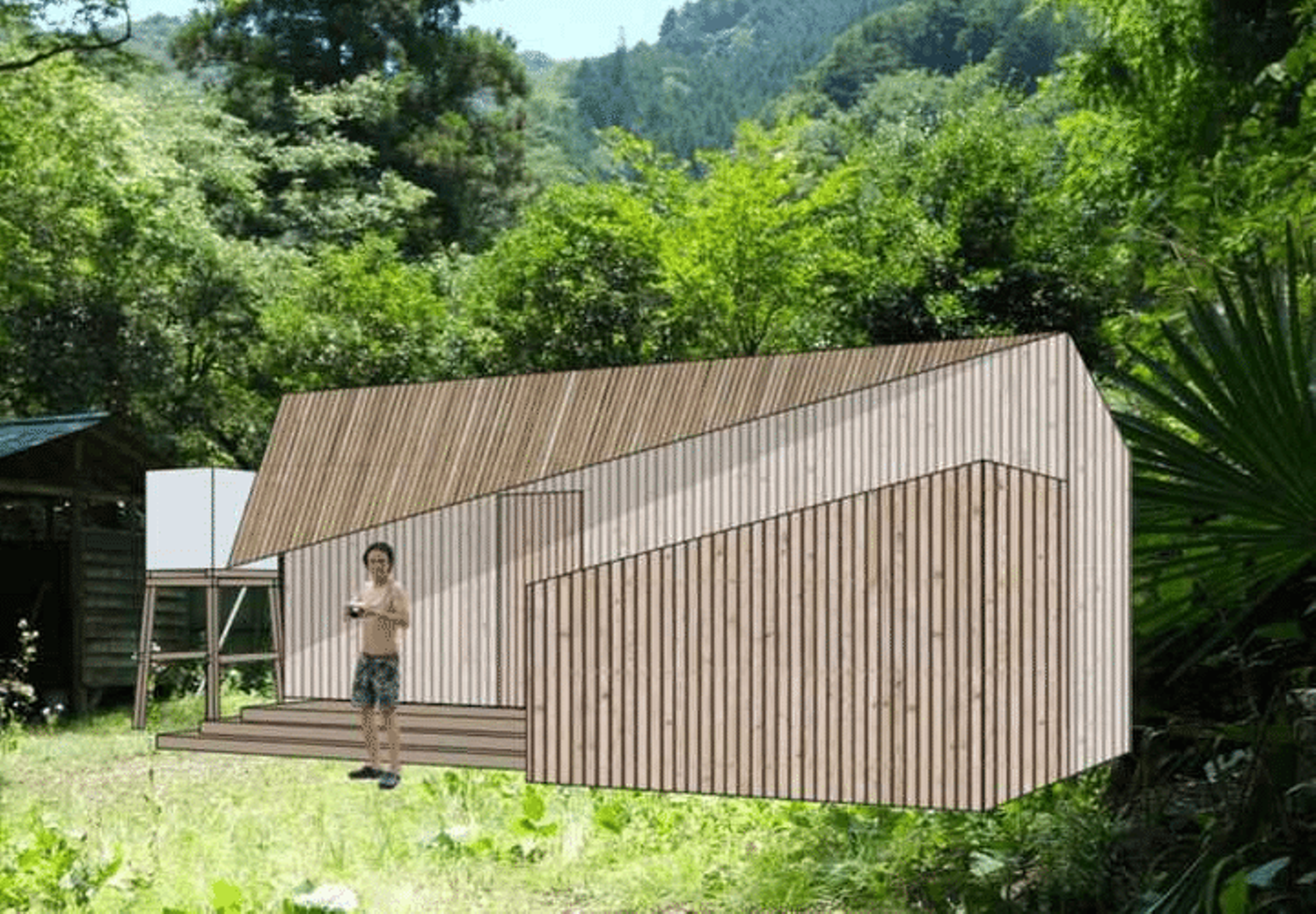 サウナ小屋デザインのテーマとして僕が伝えたのは、『斬新でありながら地産地消の素材を使う』こと。檜原村で調達できるヒノキ、杉、竹を取り入れたいと考えていました。