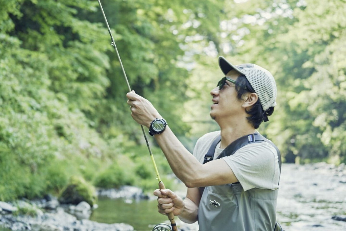 [写真] HINOKOの脇を流れる秋川で釣りをする山口
