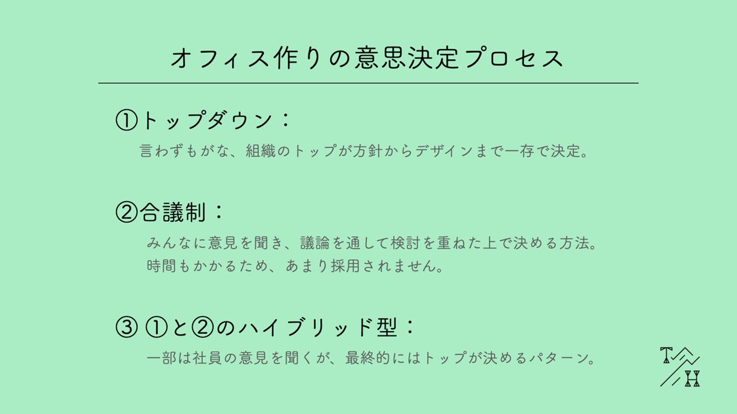 トレイルヘッズはこれまで200を超えるオフィス作りの実績がありますが、意思決定プロセスはだいたい以下の3つに分けられます。