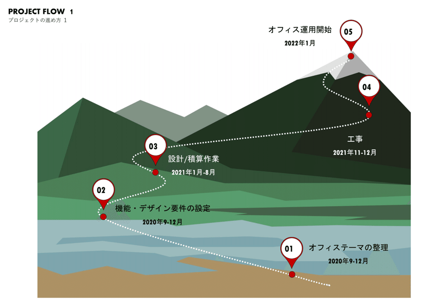 新オフィスの運用開始を1年半後に定め、コンセプトや必要な機能の要件をつめるところからスタートです。