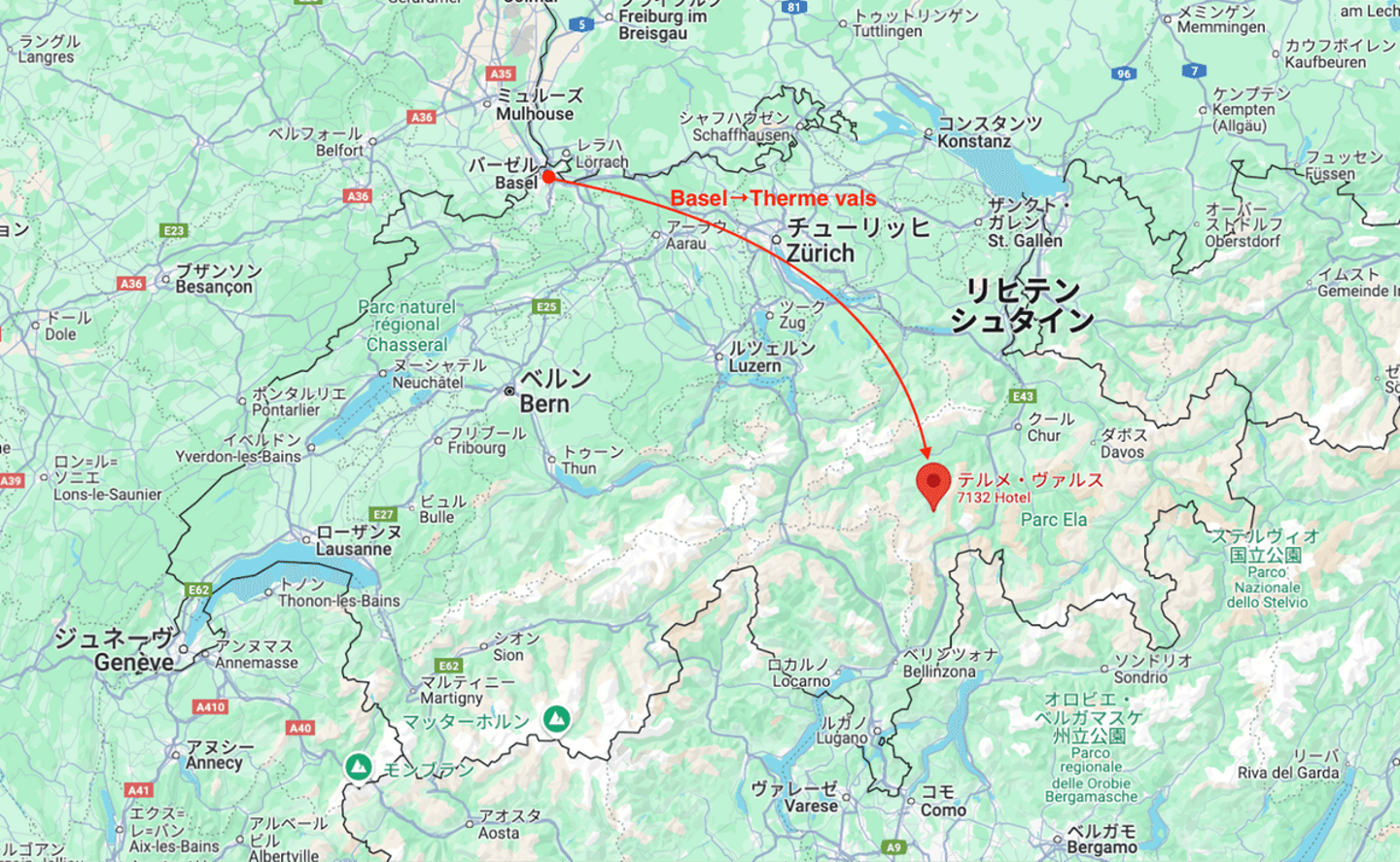 アルプス山脈に囲まれた小さな村「ヴァルス」に位置しており、バーゼルから車で約3時間、スイスを縦断するように移動しました。