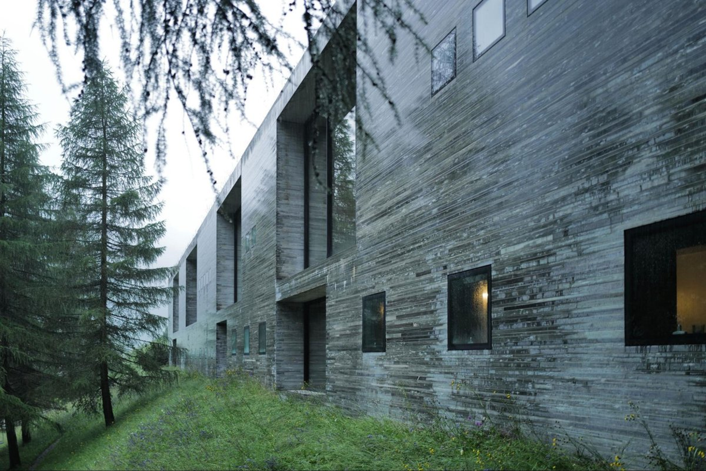 アルプスの山々に囲まれた静かな谷の中、その幾何学的な建築は、自然の中に力強く佇んでいます。