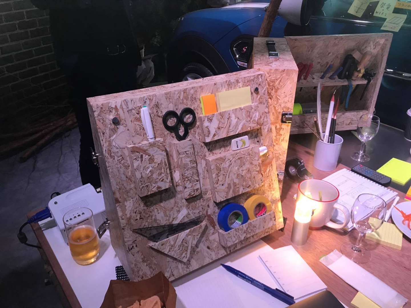 ミーティングを行う際のポストイットや文房具、家具を製作する工具までが一緒になったツールボックス