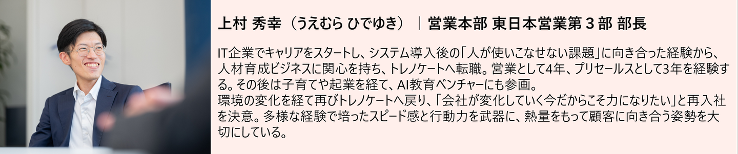 上村:「私も、自身のキャリアを振り返ると、営業として成果を出した後にプリセールスやコンサルタント職を経験し、今はマネジメントを担っています。