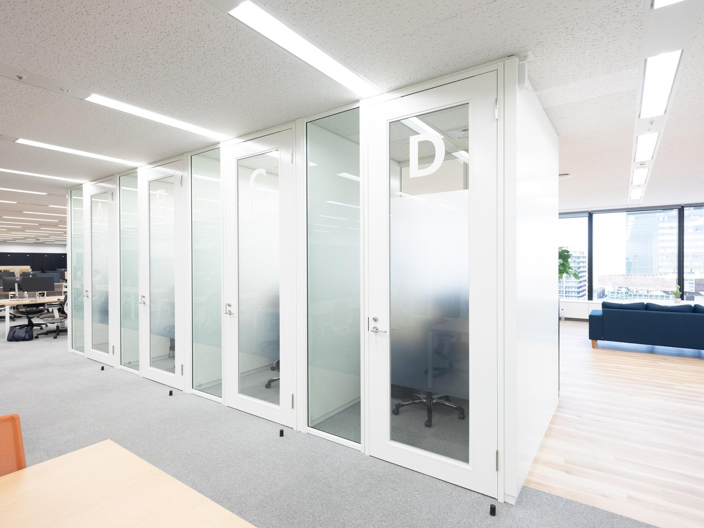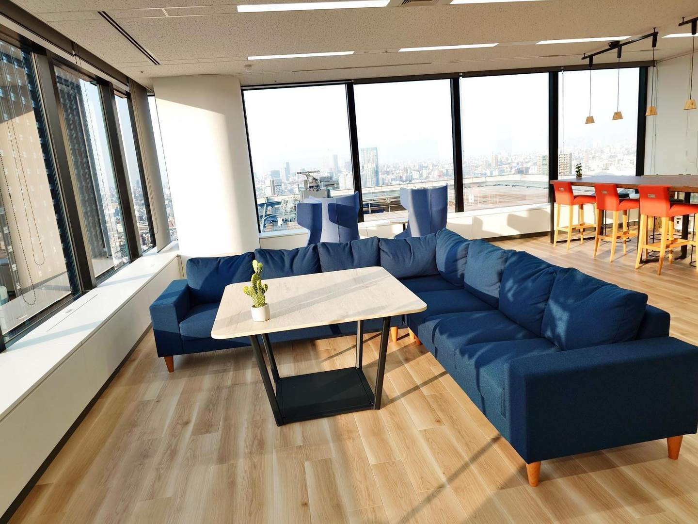 ガラス窓のそばにある開放的なミーティングスペース。