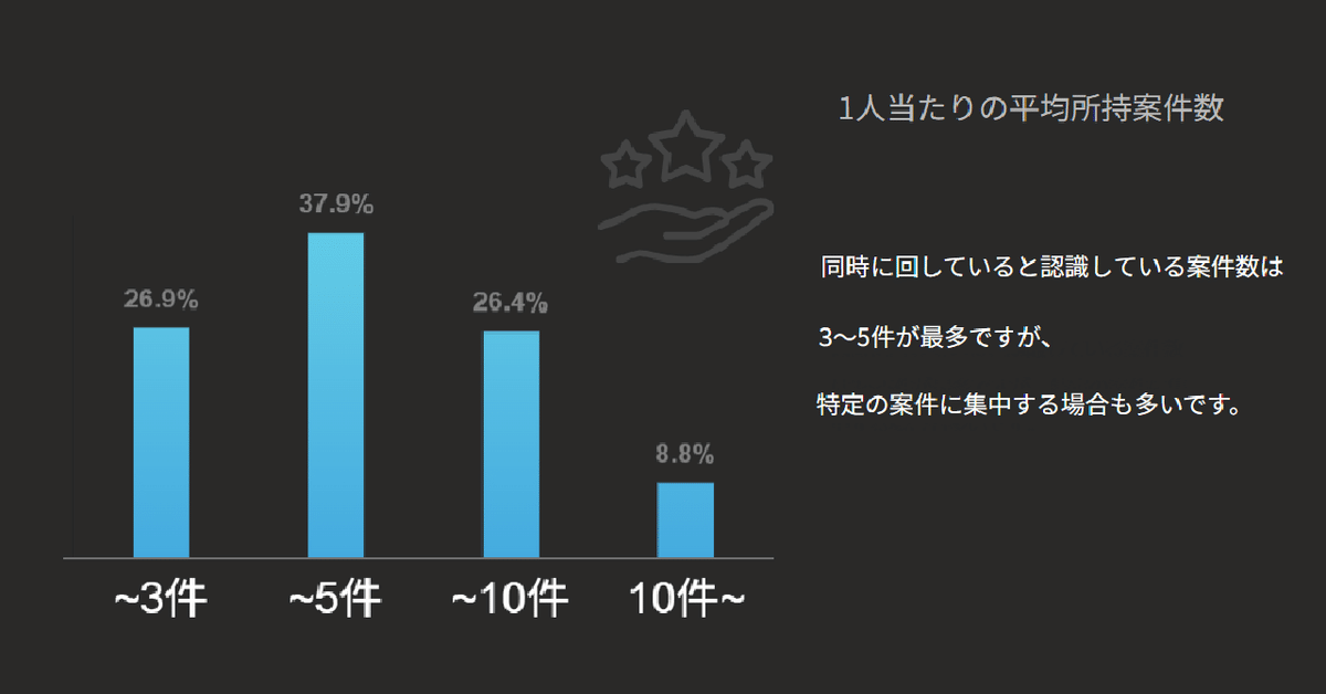 一人当たりの平均所持案件数は人によって様々ですが、案件の状況や求められるスキル、メンバーのキャリアアップなどを考慮してアサインされます