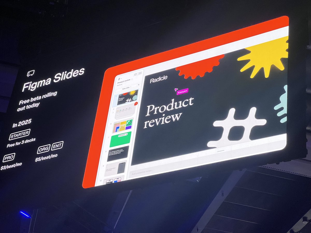 Figma Slideという新製品リリース(One more thing) Figmaに関する発表のまとめを喋っているときにディランさんが突然「スピーカーノートをみせてくれないか」と一時中断。 プレゼンテーション画面からスライドの編集画面に変わり、あれディランさん、喋ること忘れちゃったのかな?と思ったのですが、次の瞬間、湧き上がる歓声。 そう、Figma Slideの発表でした!(茶番w)