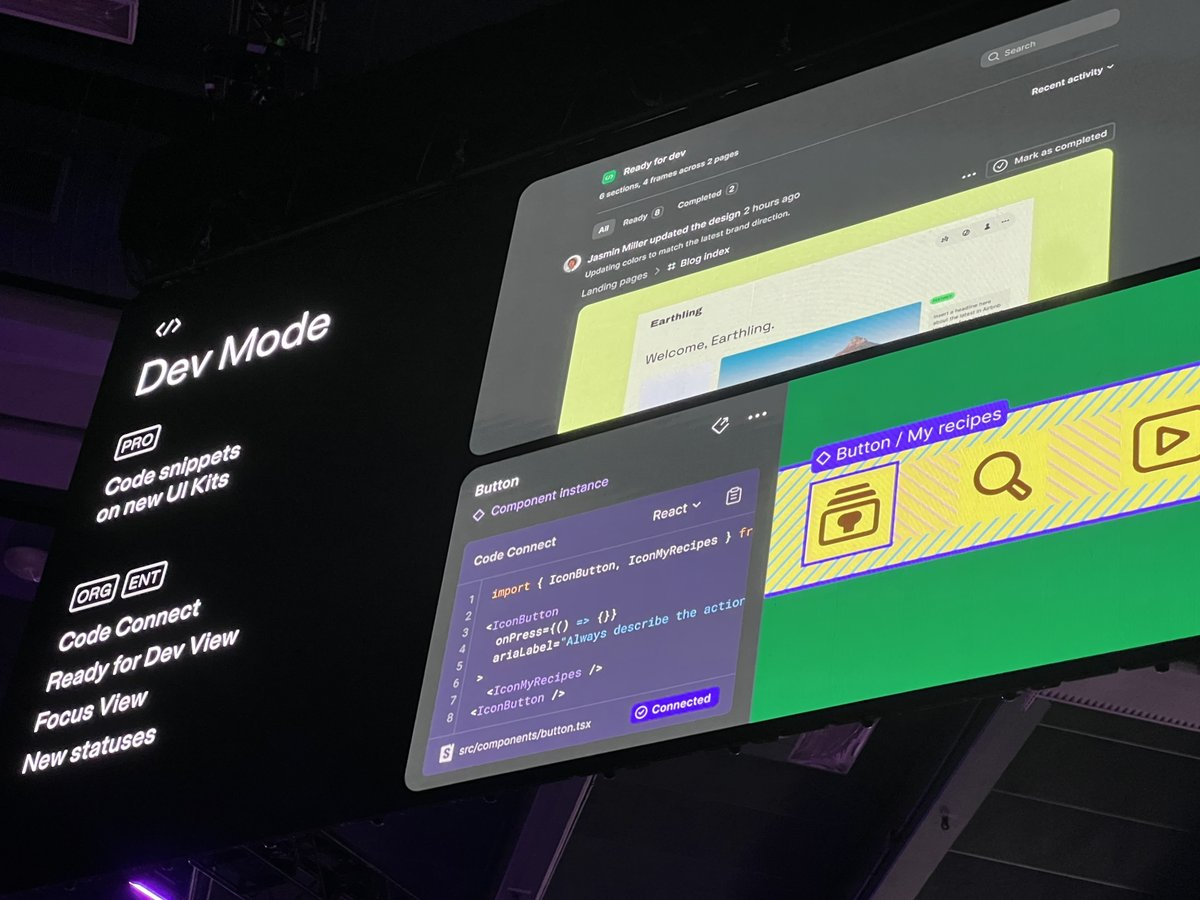 昨年、DevModeというデザインスペック(アノテーション)が見れる機能がリリースされましたが、今回はエンジニア視点でさらに開発体験を改善。 例えば、Figmaのファイル上は進行中のデザインやパターンが多く存在する一方で、エンジニアにとってはどれを反映すればわからない状態だったため、「Ready for Dev View」というデザイナーからエンジニア対してのQ出しを行う機能がリリースされました。 また「Code Connect」ではエンジニアがデザイン反映時にコーディングした実際のソースコードをFigma側に連携することもできるようになりました。