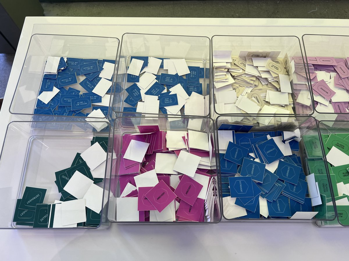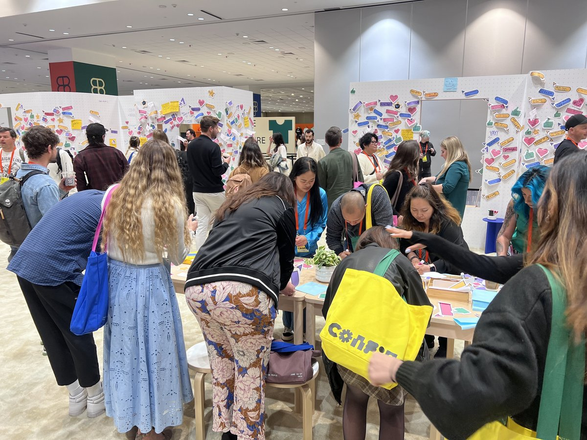 会場に入ると様々な国の言語が飛び交っており、世界中のデザイナーが集まっていることを実感。 そして特に感じたのは”Figmaはユーザーコミュニティを大事にしている”ということ。 例えば入館バッジには「Friends of Figma」「Developer」「Student」などのシールを貼ることができ、配られるトートバッグにも好きなグラフィックをアイロン転写できるなど、組み合わせや貼り方でデコレーションしながら自分を表現できるようになっていました。 私も含めてデザイナーたちはクラフト魂が刺激され、カスタマイズにハマっていました!
