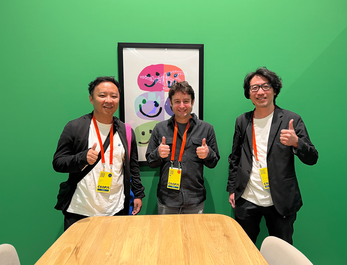 ▼共同創業者のディランさん(真ん中)に偶然お会いしたところをパシャリ。上司の齋藤勝重さん(右)と私(左)。