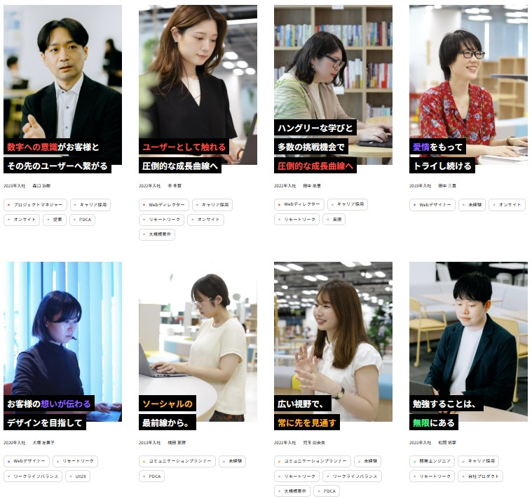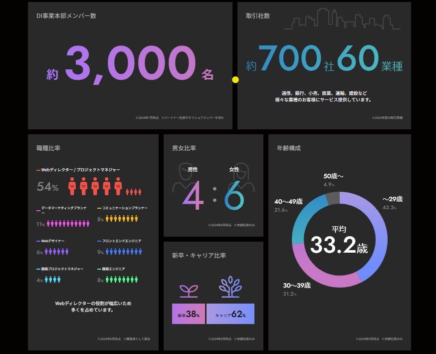 新しいサイトは、私たちのビジョンやミッション、事業内容、取り組み事例、社員インタビューなど、メンバーの声を交えてわかりやすく伝えることを目的としています。またDI事業本部の統計データを色々と公開しています。現在応募している職種についても具体例とともに紹介していますので、気になる方、ぜひご覧ください。