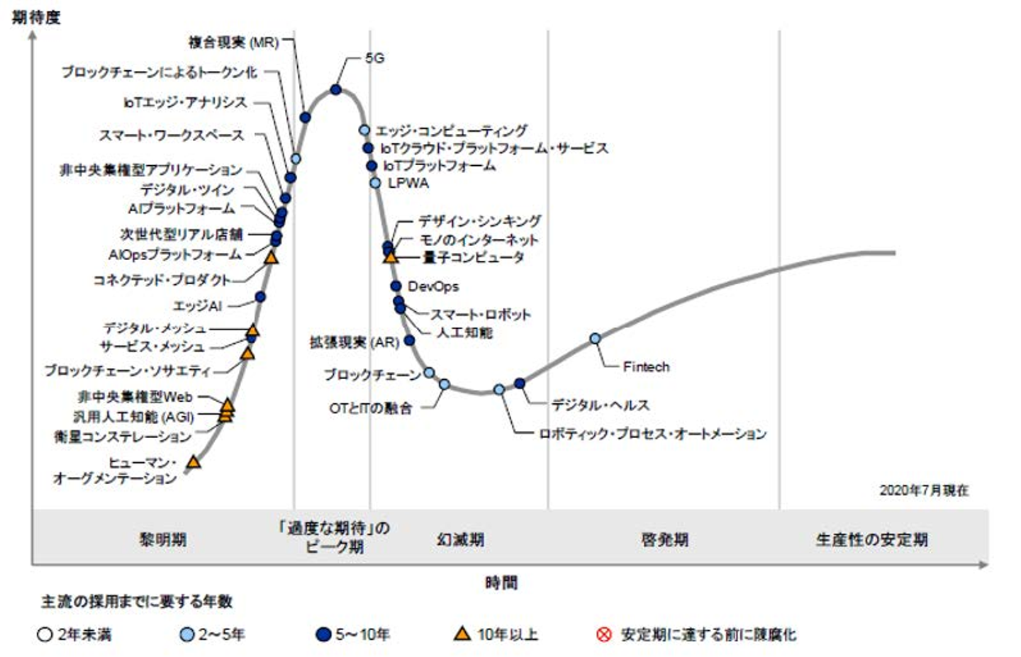 たとえばAIブームに関するワードは、2015年頃から一気に加熱し、2017年頃に「過度な期待のピーク」を迎え、2019年には幻滅期に入ったとするレポートが出てたりします。