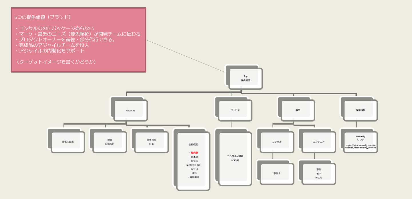 Topページではブランドイメージを出して終わりだと思うのだけど、わかりやすいブランドイメージがまだない会社なので、『5つの提供価値』の様にして、上記を並べるのがよいのではないかなと。