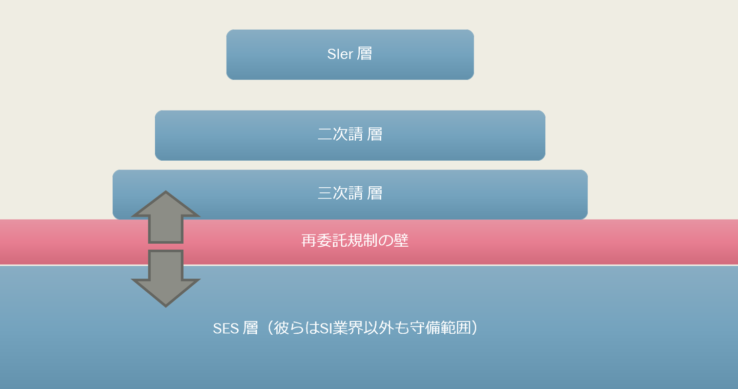 これは受注者から見れば、2次請け・3次請けまでしか参加できないという事になります。(3次請けに派遣契約で入るとかはOKだったりするらしい) 下図のように、見えない再委託規制の壁が出現し、案件が激減。SES事業者も3次請けを選ぶか、SI下請商流から離脱するかの選択を迫られる事になりました。